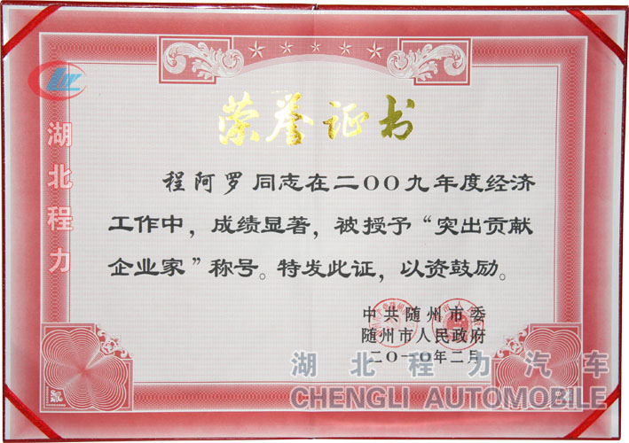 2010年2月26日,正月十三,經過程力公司2009年全體員工共同努力,榮譽的桂冠再次給了程力公司及公司總經理程阿羅,在神農大劇院隆重召開的隨州市2009年度總結表彰暨全市深入“推進全民創業擴大對外開放 建設工業強市”動員大會上。湖北程力公司及總經理程阿羅榮獲“2009年度突出貢獻企業”、“2009年度突出貢獻企業家”“優秀企業家”光榮稱號。