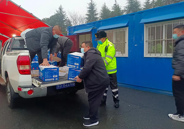 2022年春節臨近之際,按隨州地方風俗臘月24,正是闔家歡聚過小年的喜慶之日,程力汽車集團股份有限公司工會組織中高層領導和志愿者十余人,用皮卡車滿載著蘋果、梨子、方便面及定制的礦泉水,冒著風雪嚴寒和水霧,前往隨州市何店高速路口收費站,慰問堅守在這里抗疫的曾都區城管局一線員工,并向他們不懼艱難風險的無私奉獻精神表示崇高的敬意。