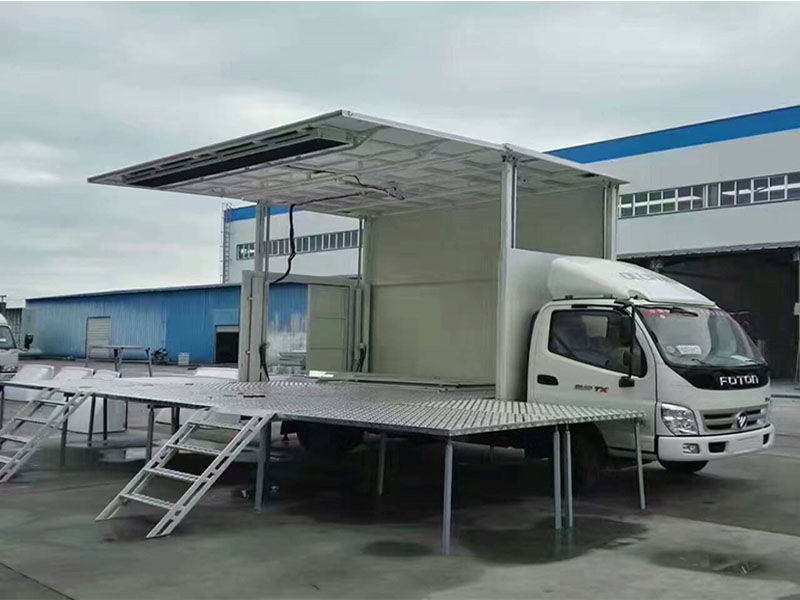 流動(dòng)舞臺(tái)車(英文:Flow stage car)是一種方便流動(dòng)演出,可展開(kāi)成為舞臺(tái)的特種汽車;新式流動(dòng)舞臺(tái)車搭配有LED顯示屏也叫LED流動(dòng)舞臺(tái)車。全自動(dòng)流動(dòng)舞臺(tái)車箱體是通過(guò)機(jī)械裝置自動(dòng)展開(kāi)、搭建成具有頂棚和舞臺(tái)板的演出舞臺(tái),并配備安裝舞臺(tái)燈光、音響、電源接口、自動(dòng)控制系統(tǒng)等設(shè)備的專用車。流動(dòng)舞臺(tái)車上裝舞臺(tái)廂體整體采用鋁型材和沖壓件組合骨架,外板為鋁合金平板,內(nèi)飾為防水膠合板,程力舞臺(tái)車的舞臺(tái)板采用防水、防滑、防火的腹面膠合板;側(cè)板和頂板分別由四個(gè)液壓油缸控制展開(kāi)即成舞臺(tái)的臺(tái)頂,底板展開(kāi)四個(gè)液壓油缸控制成舞臺(tái),省去傳統(tǒng)搭臺(tái)程序,省時(shí)省力操作簡(jiǎn)便安全可靠,功能齊全,外觀美觀。